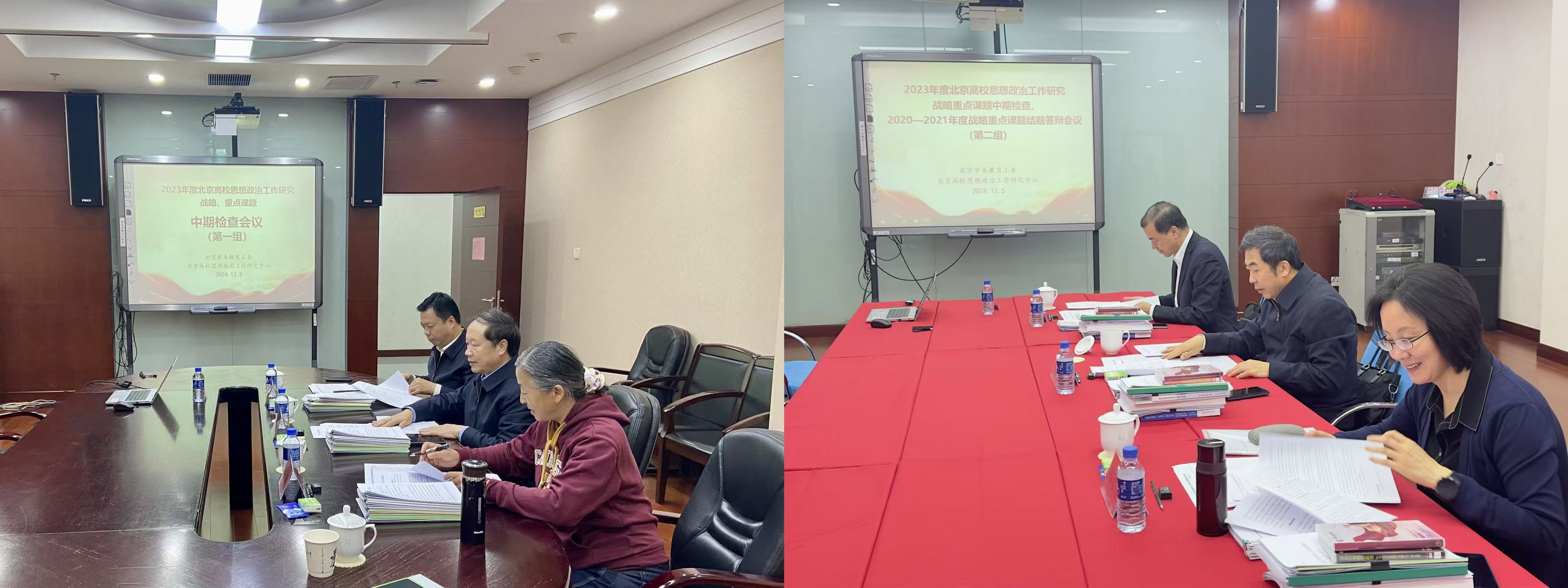 2024年12月5日上午,北京市委教育工委、北京高校思想政治工作研究中心在北京交通大学组织召开2023年度北京高校思想政治工作研究战略重点课题中期检查、2020-2021年度部分战略、重点课题结题答辩会议。中共北京市委党校原常务副校长、北京市政协委员、学习委员会副主任、市社科联第七届委员会副主席王民忠,中央音乐学院原党委书记赵旻,清华大学党委常务副书记向波涛,北京电子科技职业学院党委书记张启鸿,北京邮电大学马克思主义学院院长周晔,中国地质大学(北京)马克思主义学院院长杨峻岭担任评审专家。会议分两组进行,分别由王民忠和赵旻主持。